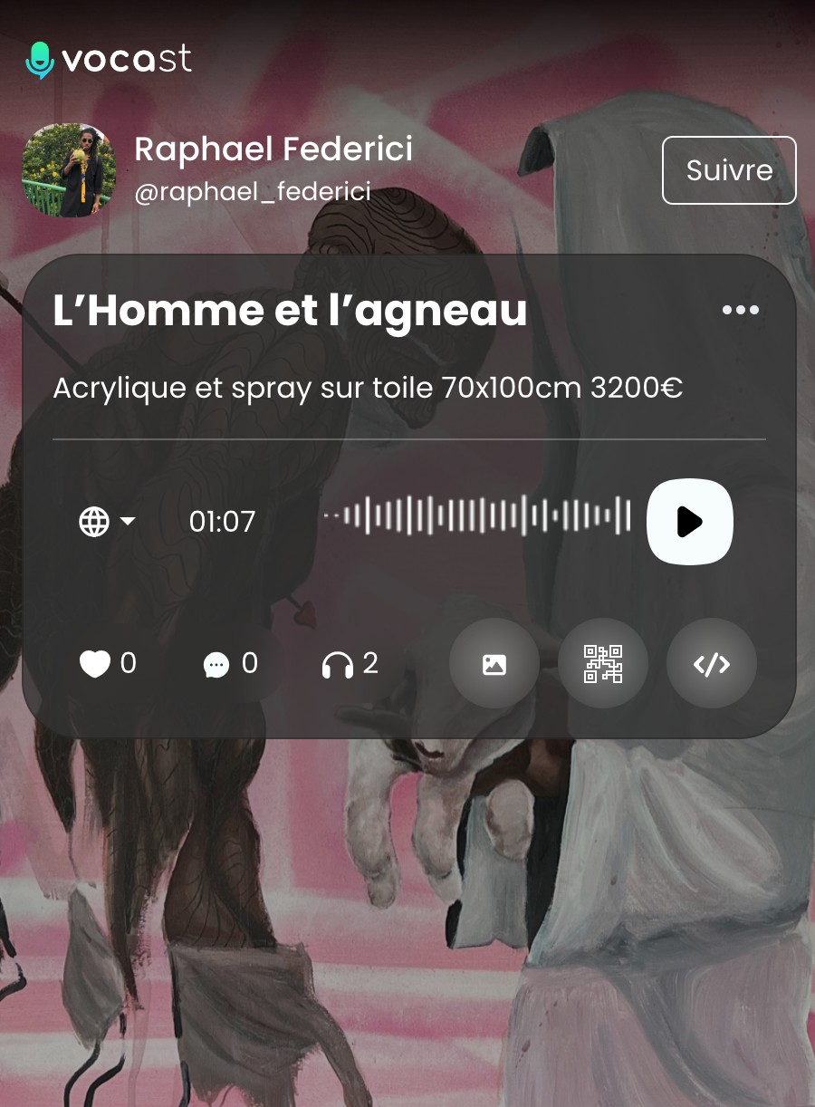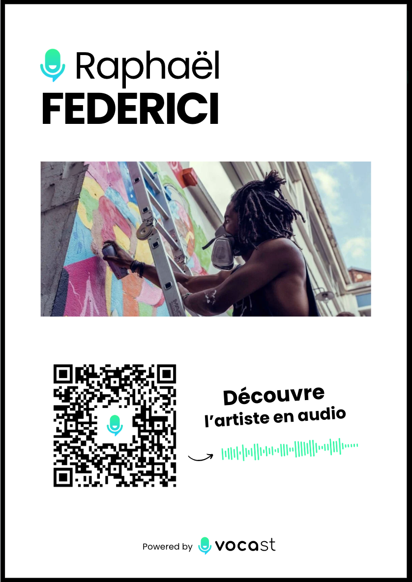 Raphaël a souhaité créer une relation plus profonde et intime avec son public. Ainsi, pour chaque tableau, il enregistre des narrations captivantes dans lesquelles il dévoile ses sources d'inspiration, sa démarche artistique et ses techniques. Pour rendre cette expérience immersive accessible à tous·tes - en multi-langue - il génère des QR codes vocaux à imprimer sur les cartels de ses œuvres, ce qui lui permet de se rendre présent et de partager son aura dans chacune des galeries qui l'exposent.