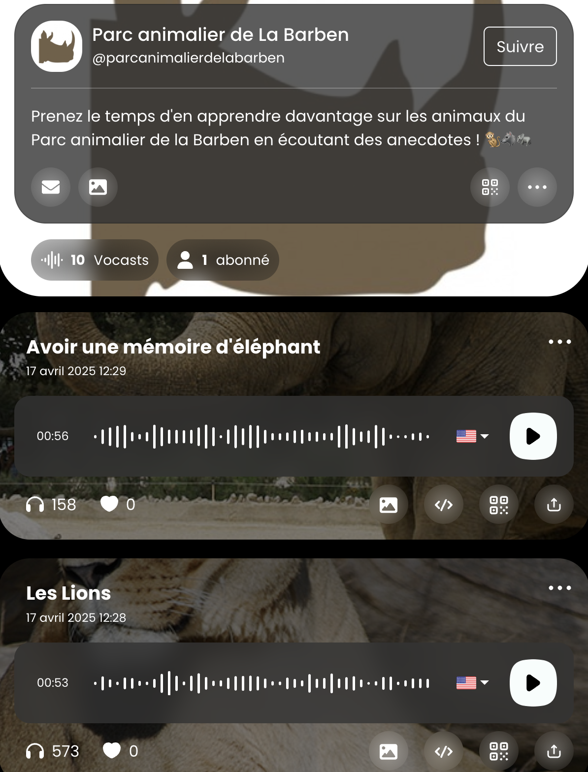 Souhaitant offrir à ses visiteur·euse·s une expérience encore plus vivante et immersive, le Zoo de la Barben a choisi d’installer des QR codes Vocast tout au long de son parcours de découverte. En scannant avec leur smartphone, les visiteurs découvrent des anecdotes fascinantes, les sons emblématiques des animaux et des informations enrichissantes, disponibles en plusieurs langues.