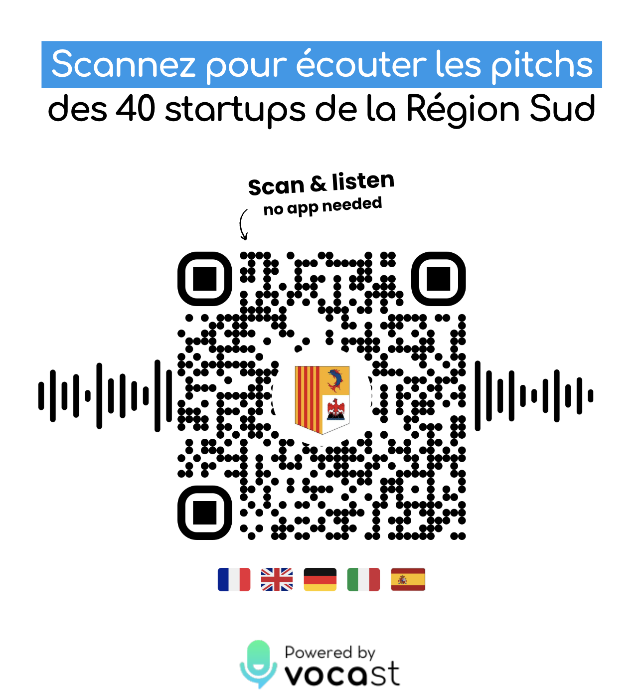 En scannant les QR codes Vocast, les visiteurs ont pu suivre un parcours sonore immersif, découvrant les pitchs audio des startups du Pavillon Ma Région Sud, en français ou en version multilingue.